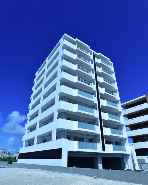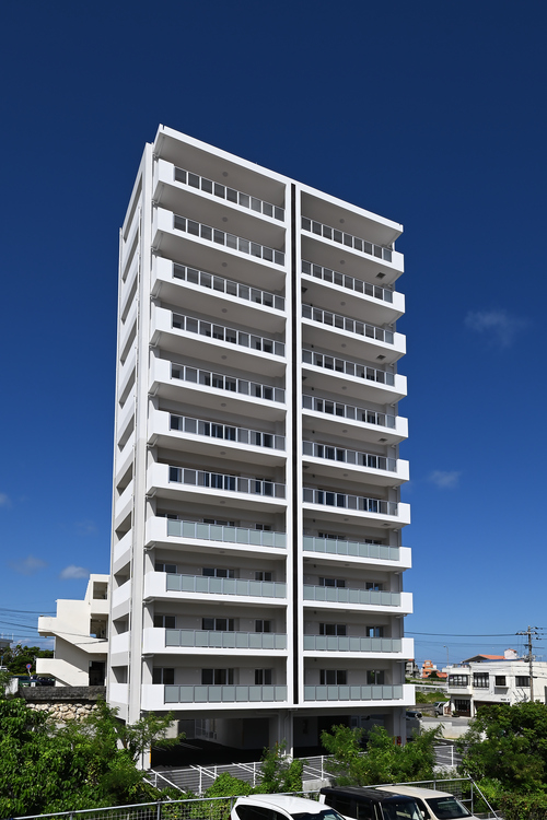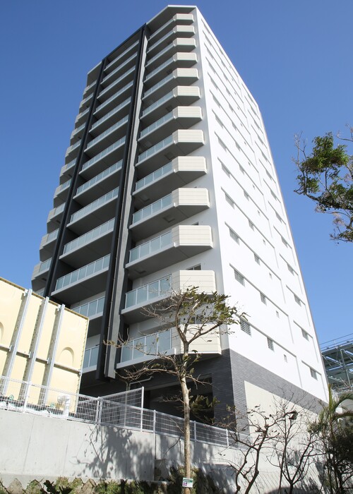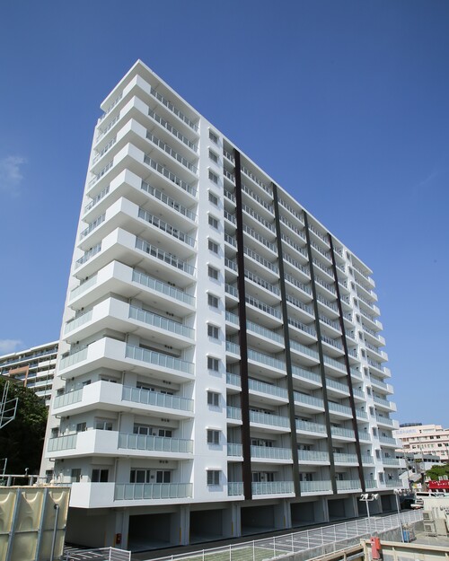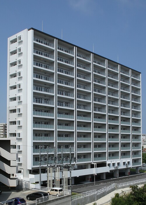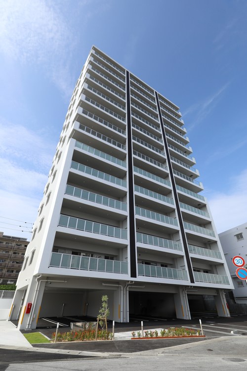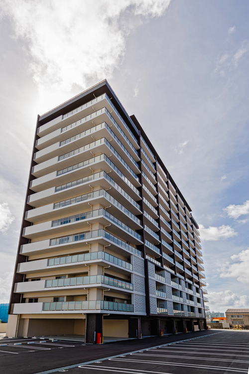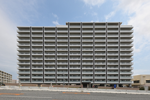 14階建てのタワー棟と7階建てのレジデンス棟をL字型に配置し、エキスパンションで繋げた2棟構成のマンション。良好な地盤だからできる「直接基礎工法」を採用。